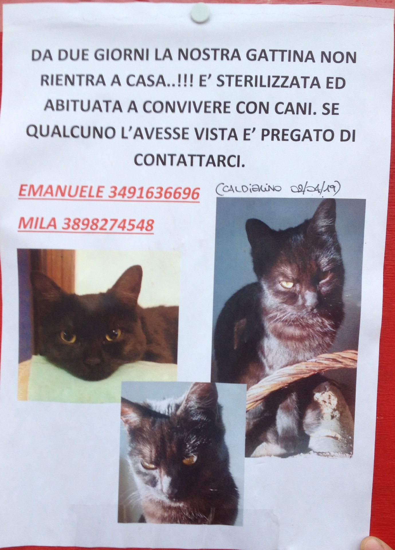 Abbiamo notato delle somiglianze tra la vecchia gattina scomparsa di Betty (Birba) e quella citata in questo cartello di smarrimento...